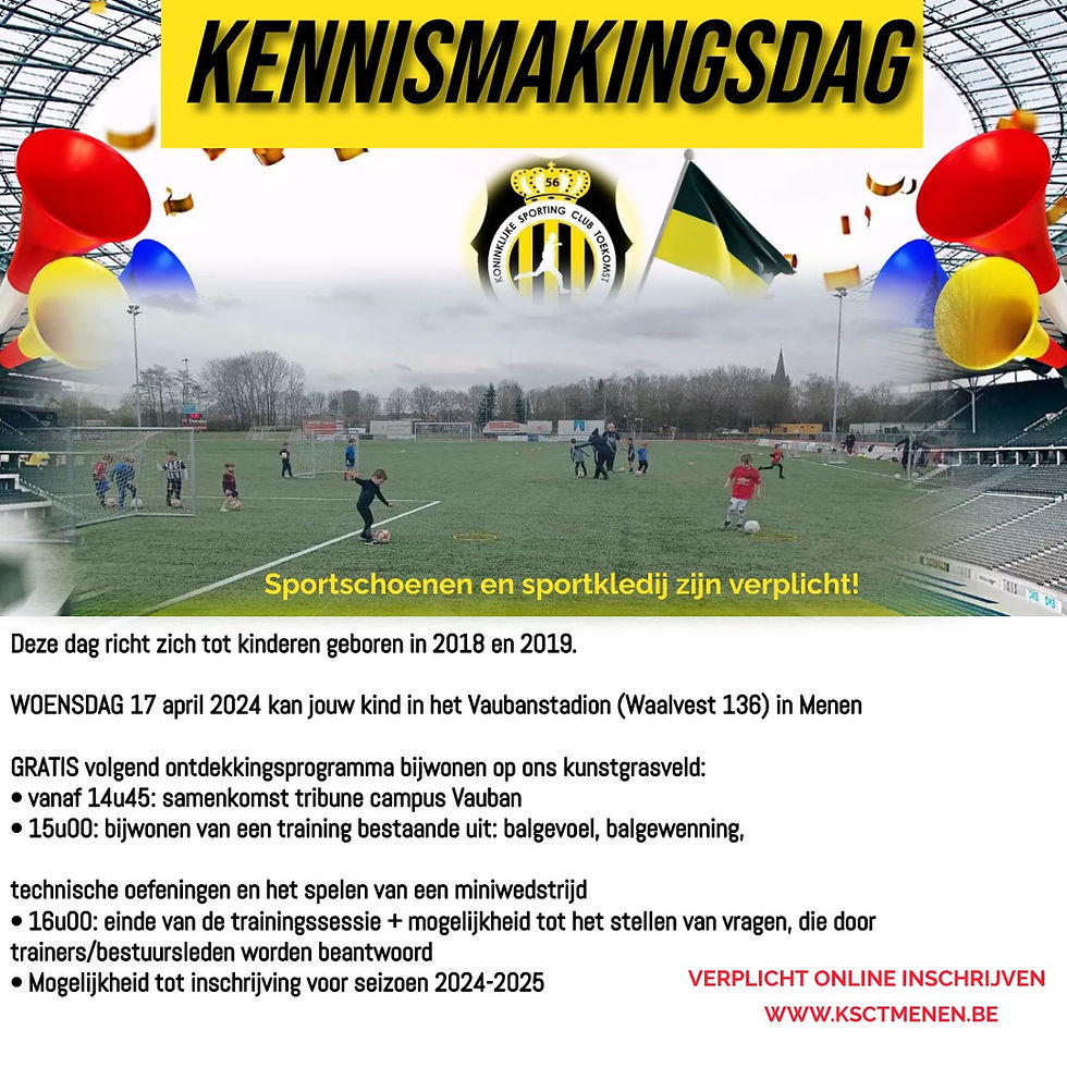 Maak kennis met KSCT Menen27 feb 20241 minuten om te lezenWees er tijdig bij, schrijf u in via onderstaande link;www.ksctmenen.be op deze link#samensterk